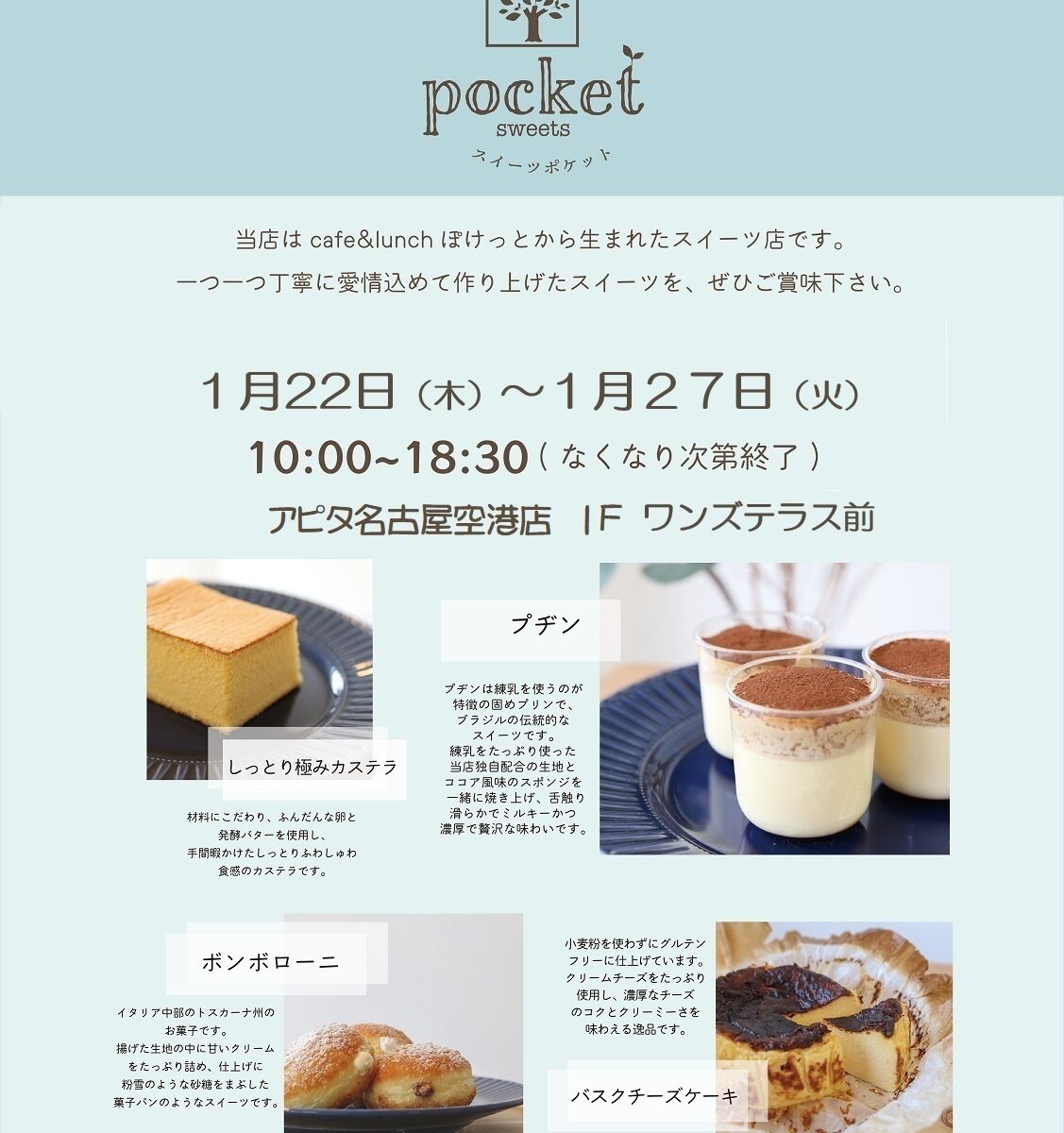 プヂン、極みカステラ、バスクチーズケーキ、カヌレ、ボンボローニなど、sweets pocketの人気のお菓子を取り揃えております。